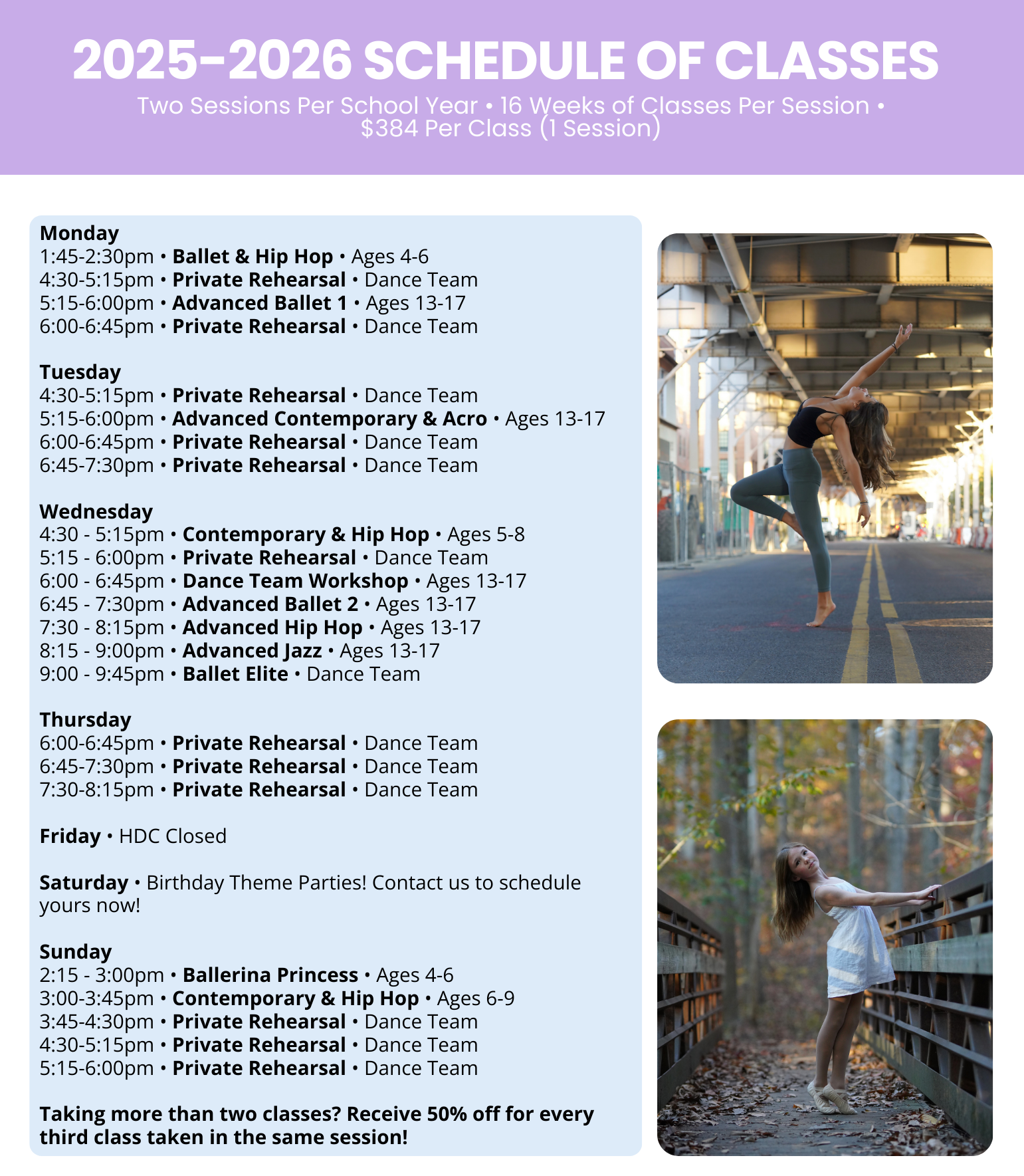Session B classes begin February 2, 2026.Click here to view & download our 2025-26 calendar! Contact us to reserve a spot in class for your dancer! Call email